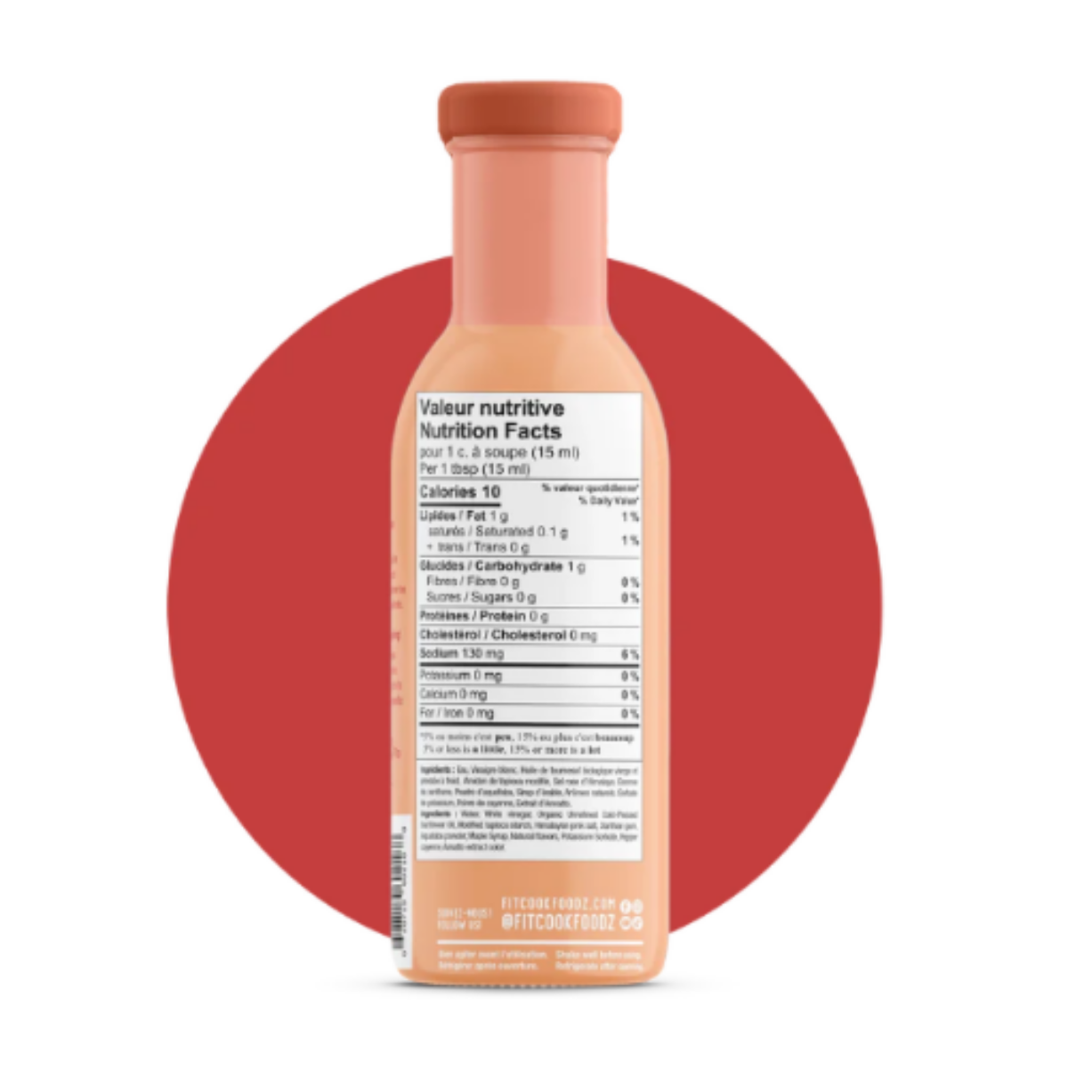 Eau- Vinaigre blanc- Huile de tournesol biologique vierge et pressée à froid- Amidon de tapioca modifié- Sel rose d’Himalaya- Gomme de xanthane- Poudre d’aquafaba- Sirop d’érable- Arômes naturels- Sorbate de potassium- Poivre de cayenne- Extrait d’Annatto.